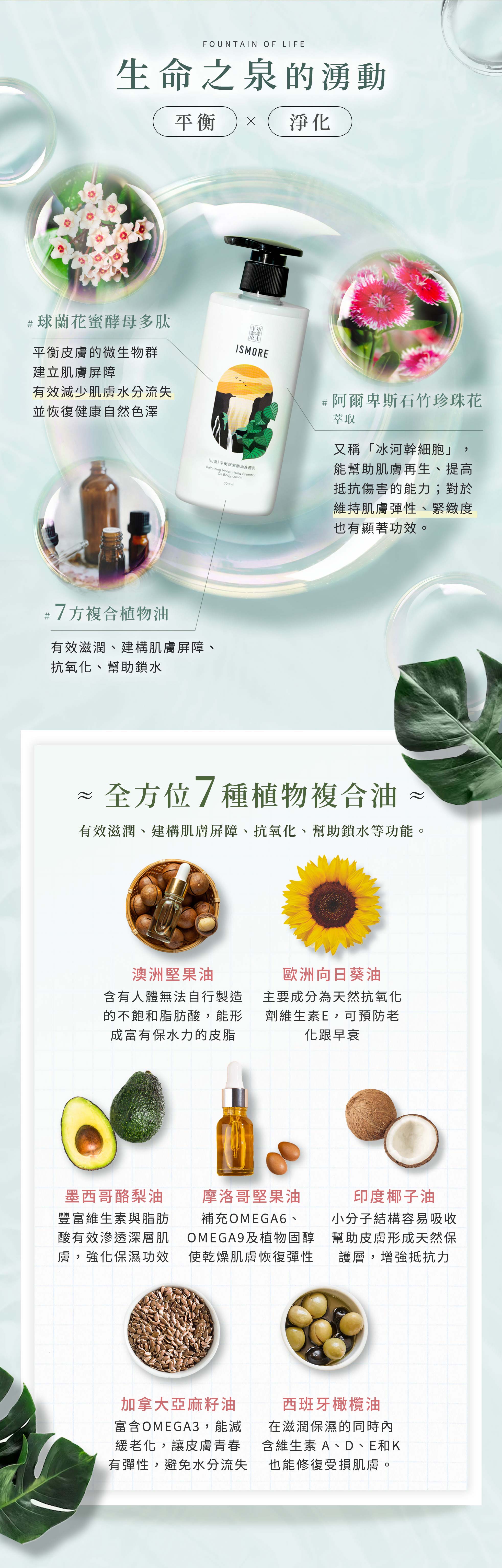 2.七方複合植物油:澳洲堅果油、歐洲向日葵油、墨西哥酪梨油、摩洛哥堅果油、印度椰子油、加拿大亞麻籽油、西班牙橄欖油
