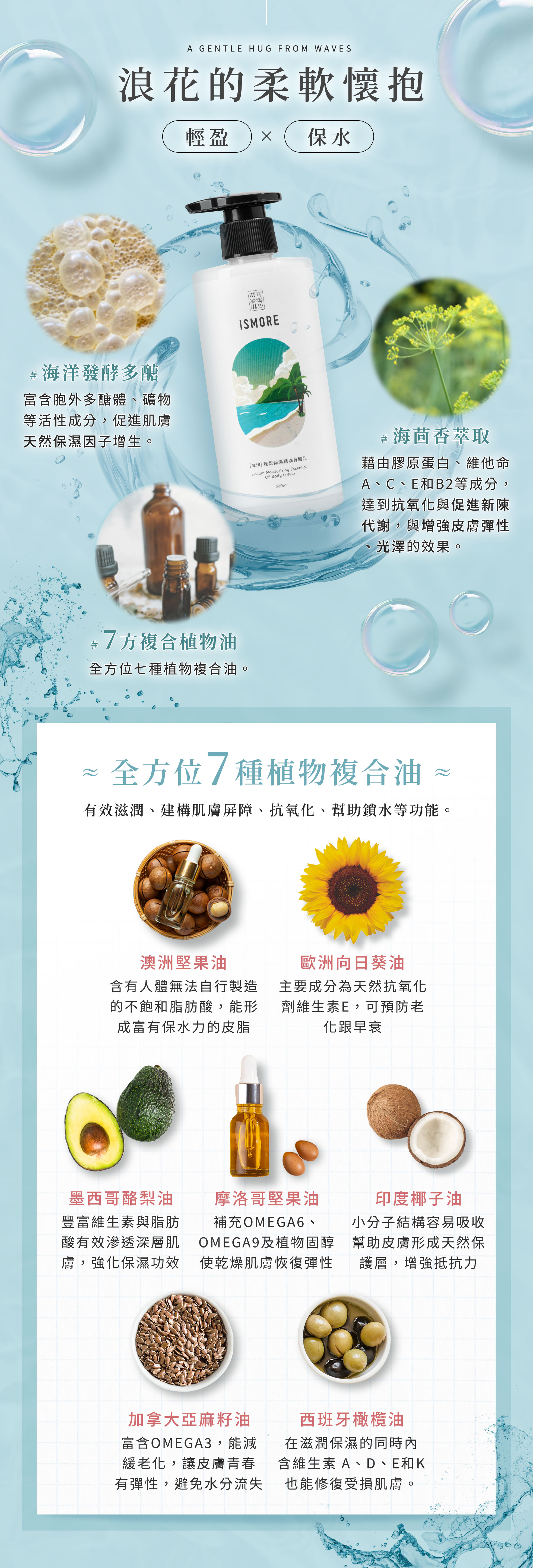 2.七方複合植物油:澳洲堅果油、歐洲向日葵油、墨西哥酪梨油、摩洛哥堅果油、印度椰子油、加拿大亞麻籽油、西班牙橄欖油